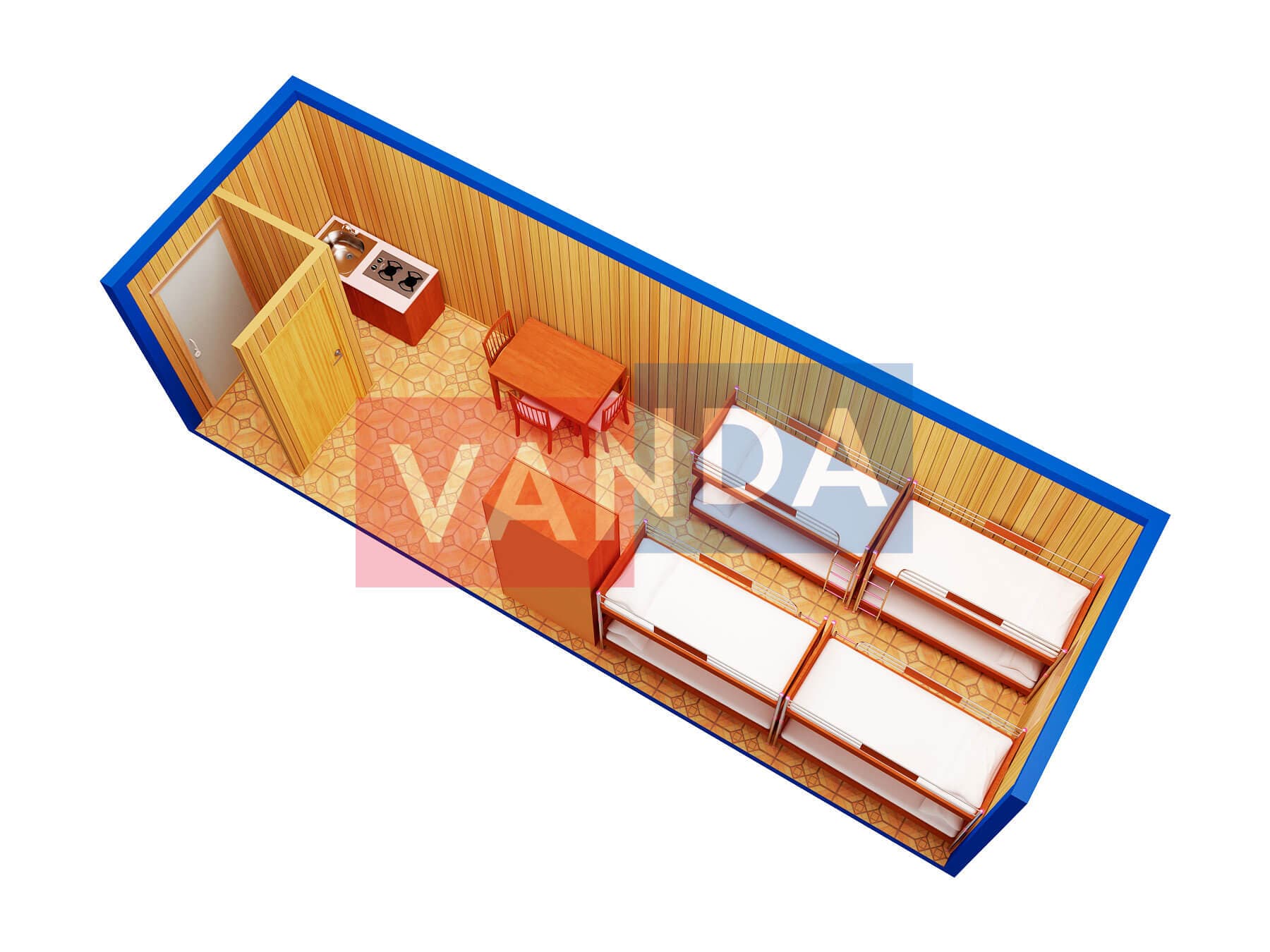 Блок контейнер металлический с 8 кроватями изготавливается из несущего каркаса (верхняя и нижняя обвязка): швеллер 100х50х3 мм., угловые стойки: сложно - гнутый угол 90х90х3 мм., крыша блок-контейнера: металл сварной 0,9-1 мм., качественная наружная отделка: оцинкованный профлист, внутренняя отделка стен: Вагонка деревянная, внутренняя отделка потолка: Вагонка деревянная, вспомогательный деревянный каркас (стены): брусок 40х75 мм., лаги пола: обрезная доска 40х100 мм., лаги потолка: обрезная доска 40х100 мм., выполнено утепление: Минеральная вата «ISOVER» – 50 мм. и пароизоляция: плёнка техническая, черновой пол состоит из: обрезная доска 20 мм. (2 сорт), чистовой пол покрыт: ДСП строительное 16 мм., отделка пола выполнена из качественных материалов. Контейнер комплектуется окнами: деревянное, двойное остекление 800х1000, входной дверью: ДГ 21-8 обшита снаружи оцинкованным листом, врезной замок и внутренними дверями: ДГ 21-8 (при наличии перегородки). Если в БК присутствуют перегородки, то для них используется: брусок 40х50 мм.