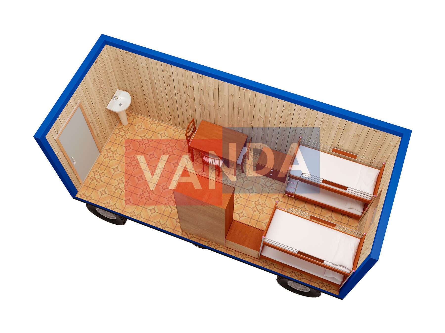 Блок-контейнер на шасси 5,85х2,4 изготавливается из несущего каркаса (верхняя и нижняя обвязка): швеллер 100х50х3 мм., угловые стойки: сложно - гнутый угол 90х90х3 мм., крыша блок-контейнера: металл сварной 0,9-1 мм., качественная наружная отделка: оцинкованный профлист, внутренняя отделка стен: Вагонка деревянная, внутренняя отделка потолка: Вагонка деревянная, вспомогательный деревянный каркас (стены): брусок 40х75 мм., лаги пола: обрезная доска 40х100 мм., лаги потолка: обрезная доска 40х100 мм., выполнено утепление: Минеральная вата «ISOVER» – 50 мм. и пароизоляция: плёнка техническая, черновой пол состоит из: обрезная доска 20 мм. (2 сорт), чистовой пол покрыт: ДСП строительное 16 мм., отделка пола выполнена из качественных материалов. Контейнер комплектуется окнами: деревянное, двойное остекление 800х1000, входной дверью: ДГ 21-8 обшита снаружи оцинкованным листом, врезной замок и внутренними дверями: ДГ 21-8 (при наличии перегородки). Если в БК присутствуют перегородки, то для них используется: брусок 40х50 мм.