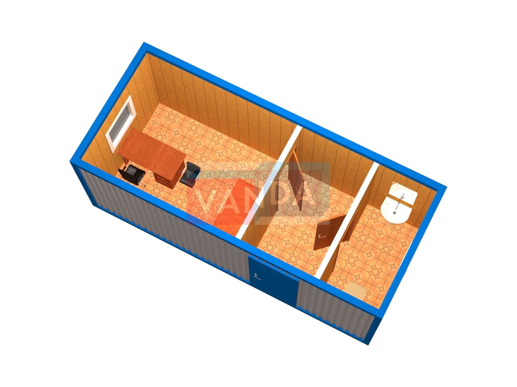 Блок контейнер офисный с перегородками и туалетом №7 (вариант 2) изготавливается из несущего каркаса (верхняя и нижняя обвязка): швеллер 120х50х3 мм., угловые стойки: сложно - гнутый угол 90х90х3 мм., крыша блок-контейнера: металл сварной 0,9-1 мм., качественная наружная отделка: оцинкованный профлист, внутренняя отделка стен: Панели МДФ, внутренняя отделка потолка: Панели ПВХ, вспомогательный деревянный каркас (стены): брусок 40х75 мм., лаги пола: обрезная доска 40х100 мм., лаги потолка: обрезная доска 40х100 мм., выполнено утепление: Минеральная вата «ISOVER» – 100 мм. и пароизоляция: плёнка техническая, черновой пол состоит из: обрезная доска 20 мм. (2 сорт), чистовой пол покрыт: ДСП строительное 16 мм., отделка пола: линолеум полукоммерческий. Контейнер комплектуется окнами: ПВХ однокамерное, одностворчатое, п/о 900х1100, входной дверью: металлическая, утеплённая (Россия) и внутренними дверями: МДФ (при наличии перегородки). Если в БК присутствуют перегородки, то для них используется: брусок 40х50 мм.