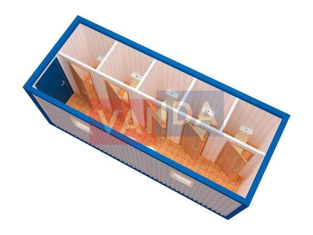 Блок контейнер сантехнический №4 изготавливается из несущего каркаса (верхняя и нижняя обвязка): швеллер 100х50х3 мм., угловые стойки: сложно - гнутый угол 90х90х3 мм., крыша блок-контейнера: металл сварной 0,9-1 мм., качественная наружная отделка: оцинкованный профлист, внутренняя отделка стен: Вагонка ПВХ, внутренняя отделка потолка: Вагонка ПВХ, вспомогательный деревянный каркас (стены): брусок 40х75 мм., лаги пола: обрезная доска 40х100 мм., лаги потолка: обрезная доска 40х100 мм., выполнено утепление: Минеральная вата «ISOVER» – 50 мм. и пароизоляция: плёнка техническая, черновой пол состоит из: обрезная доска 20 мм. (2 сорт), чистовой пол покрыт: ДСП строительное 16 мм., отделка пола: линолеум бытовой. Контейнер комплектуется окнами: ПВХ однокамерное, одностворчатое, п/о 600х600, входной дверью: ДГ 21-8 обшита снаружи оцинкованным листом, врезной замок и внутренними дверями: ДГ 21-8 (при наличии перегородки). Если в БК присутствуют перегородки, то для них используется: брусок 40х50 мм. В блок контейнере есть электро-обеспечение: электрика в кабель канале с УЗО, установлена сантехника: унитаз в комплекте - 5 шт.;