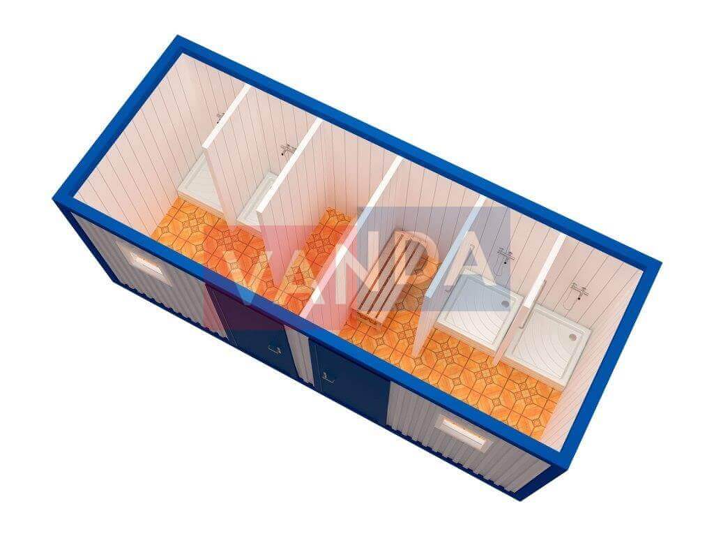 Блок контейнер сантехнический №5 изготавливается из несущего каркаса (верхняя и нижняя обвязка): швеллер 100х50х3 мм., угловые стойки: сложно - гнутый угол 90х90х3 мм., крыша блок-контейнера: металл сварной 0,9-1 мм., качественная наружная отделка: оцинкованный профлист, внутренняя отделка стен: Вагонка ПВХ, внутренняя отделка потолка: Вагонка ПВХ, вспомогательный деревянный каркас (стены): брусок 40х75 мм., лаги пола: обрезная доска 40х100 мм., лаги потолка: обрезная доска 40х100 мм., выполнено утепление: Минеральная вата «ISOVER» – 50 мм. и пароизоляция: плёнка техническая, черновой пол состоит из: обрезная доска 20 мм. (2 сорт), чистовой пол покрыт: ДСП строительное 16 мм., отделка пола: линолеум бытовой. Контейнер комплектуется окнами: ПВХ однокамерное, одностворчатое, п/о 600х600, входной дверью: ДГ 21-8 обшита снаружи оцинкованным листом, врезной замок и внутренними дверями: ДГ 21-8 (при наличии перегородки). Если в БК присутствуют перегородки, то для них используется: брусок 40х50 мм. В блок контейнере есть электро-обеспечение: электрика в кабель канале с УЗО, установлена сантехника: душевой поддон в комплекте - 4 шт.;
