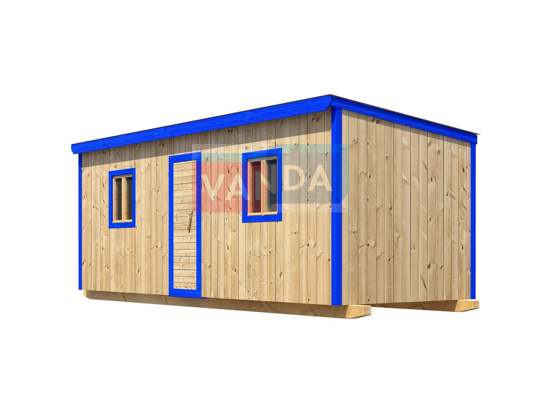 Строительная бытовка №8 (вариант 3) изготавливается из качественных материалов: обвязочный венец (сани): брус 100х150 мм., половые лаги: обрезная доска 40х150 мм., через 80 см. (плашмя), черновые полы: обрезная доска 20 мм. (2 сорт), (не сплошной настил, через 10 - 15 см.), чистовой пол покрыт: ДСП строительное 16 мм.. Для изготовления каркаса и перегородок используется: брусок 40х50 мм.. Для стропил используется: обрезная доска 40х150 мм., на кровлю ложится: оцинкованный профлист. Качественная наружная отделка: Имитация бруса, внутренняя отделка стен: Вагонка деревянная, внутренняя отделка потолка: Вагонка деревянная. Выполнено утепление: Минеральная вата «ISOVER» – 50 мм. и пароизоляция: плёнка техническая. Бытовка комплектуется окнами: деревянное, двустворчатое, одинарное остекление 800х800 мм., входной дверью: деревянная, наборная и внутренними дверями: деревянная, наборная (при наличии перегородки).