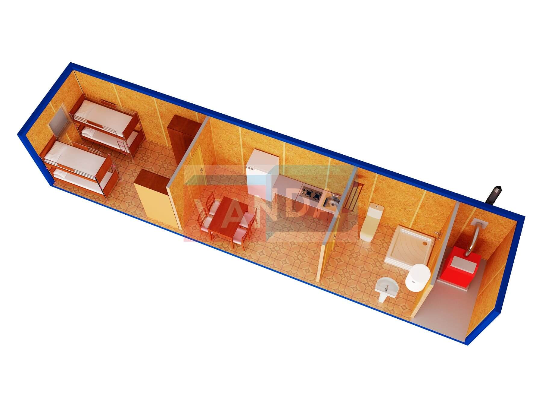 Металлическая бытовка 12,0 x 2,4 - Оргалит ДВП изготавливается из несущего каркаса (верхняя и нижняя обвязка): швеллер 100х50х3 мм., угловые стойки: сложно - гнутый угол 90х90х3 мм., крыша блок-контейнера: металл сварной 0,9-1 мм., качественная наружная отделка: оцинкованный профлист, вспомогательный деревянный каркас (стены) выполнен из брусок 40х75 мм., лаги пола: обрезная доска 40х100 мм., лаги потолка: обрезная доска 40х100 мм., выполнено утепление: Минеральная вата «ISOVER» – 50 мм. и пароизоляция: плёнка техническая, черновой пол состоит из: обрезная доска 20 мм. (2 сорт), чистовой пол покрыт: ДСП строительное 16 мм., отделка пола выполнена из качественных материалов. Контейнер комплектуется окнами: деревянное, двойное остекление 800х1000, входной дверью: ДГ 21-8 обшита снаружи оцинкованным листом, врезной замок и внутренними дверями. Если в БК присутствуют перегородки, то для них используется: брусок 40х50 мм.