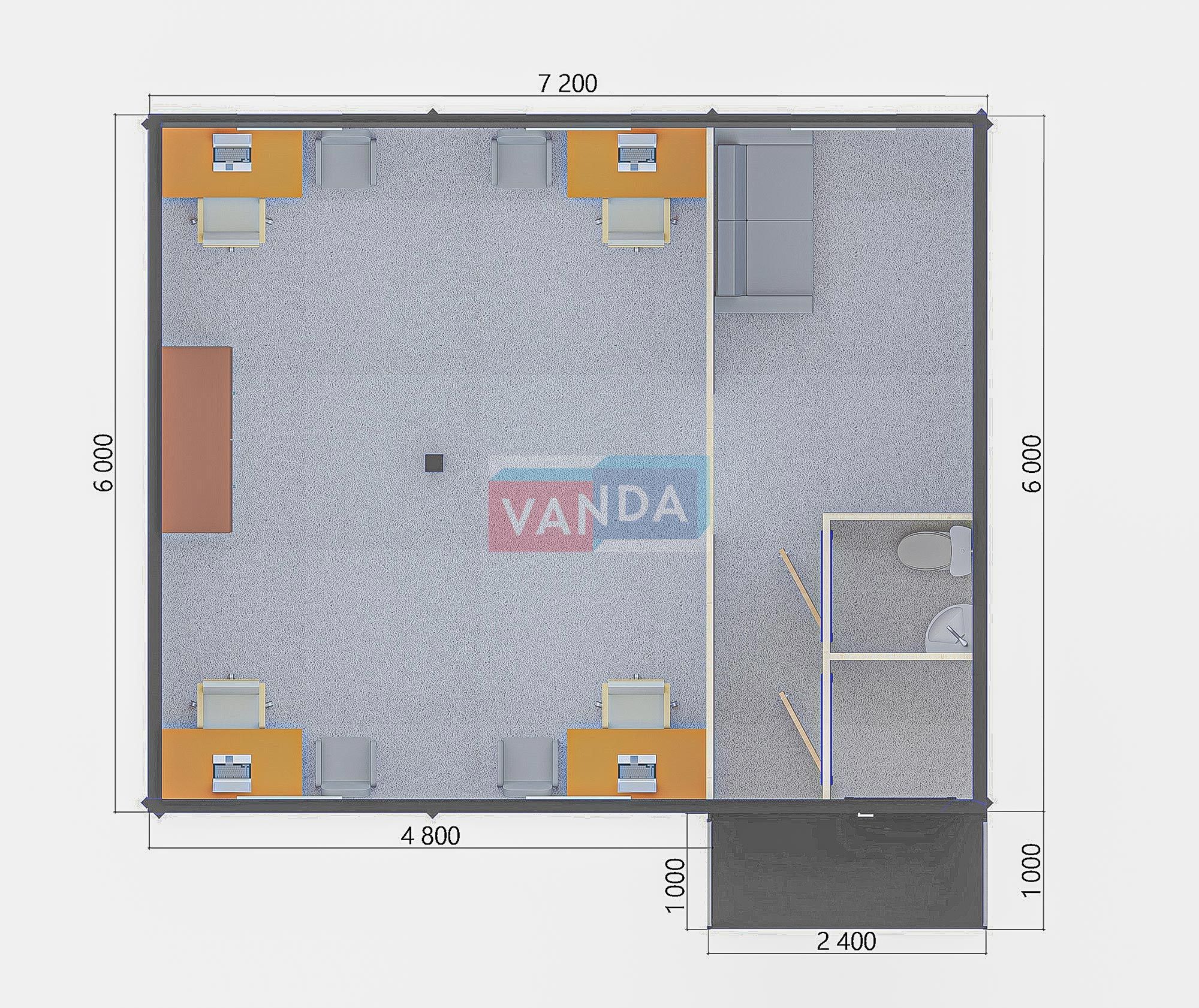 • Габаритные размеры - стандартные размеры одного модульного здания (наружные): Длина: 6 м. Ширина: 2,4 м. Высота: 2,5 м.