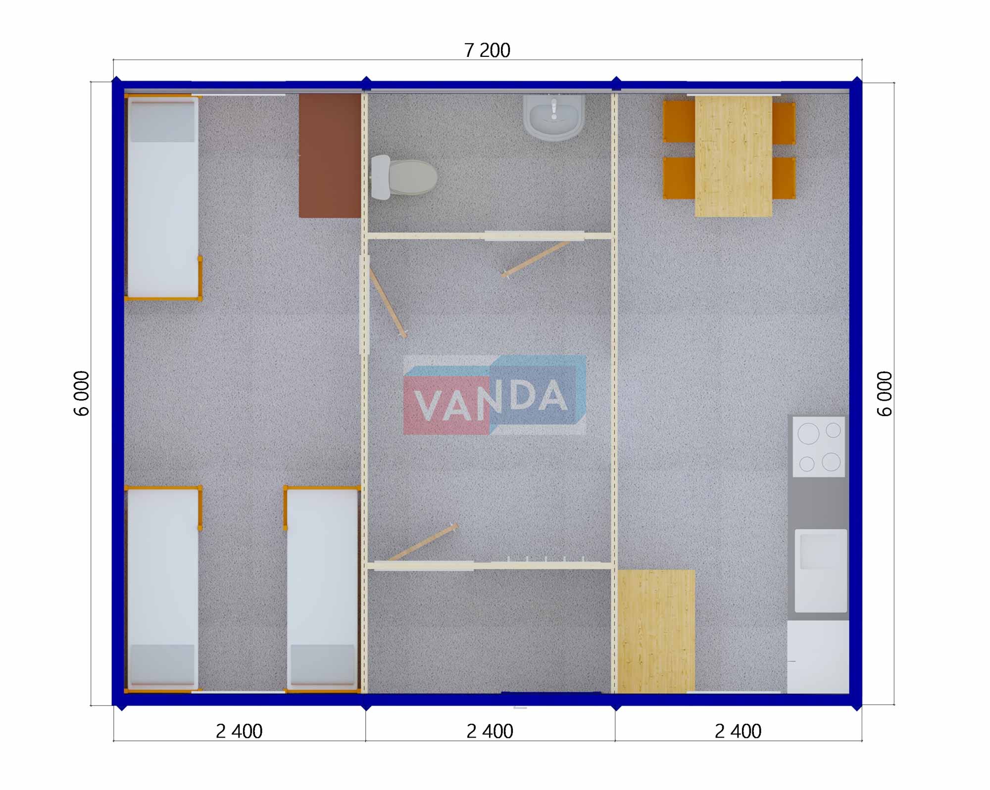 • Габаритные размеры - стандартные размеры одного модульного здания (наружные): Длина: 6 м. Ширина: 2,4 м. Высота: 2,5 м.